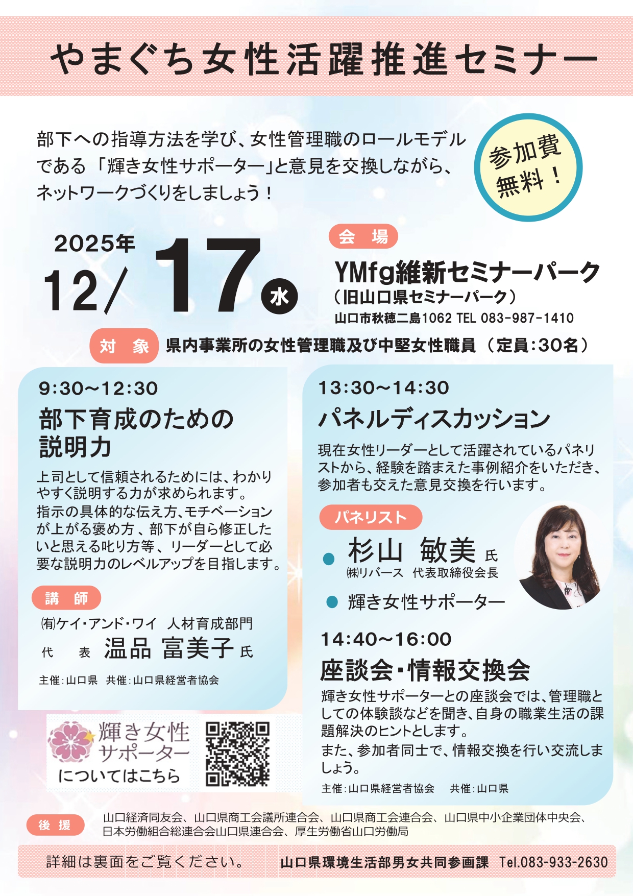 12月17日(水)13:30~「やまぐち女性活躍推進セミナー」パネルディスカッションに登壇します。